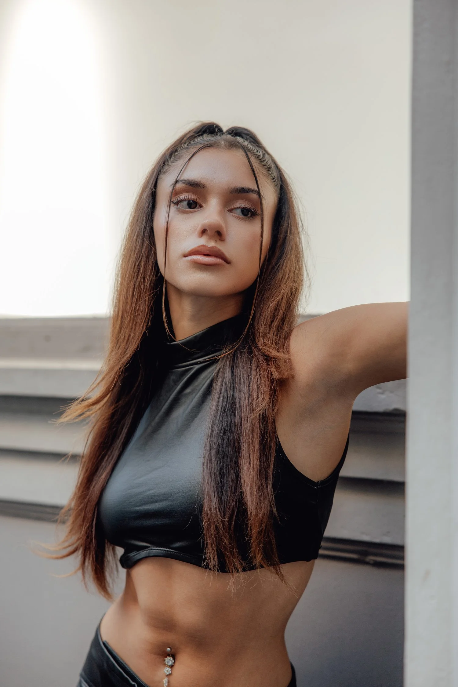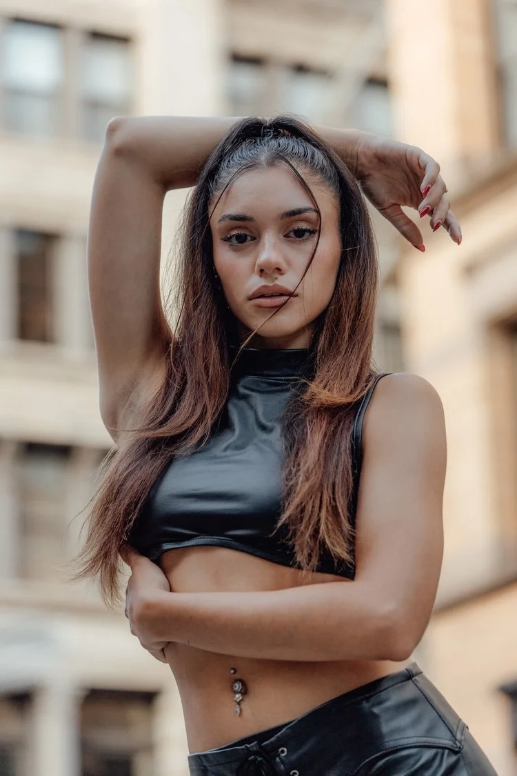 In the midst of the city's hustle and bustle, our model stands as a beacon of allure. Her leather-clad silhouette cuts through the chaos, drawing eyes with every graceful movement. Like a siren's song, she lures us into the depths of urban exploration, inviting us to embrace the intoxicating charm of the concrete jungle.