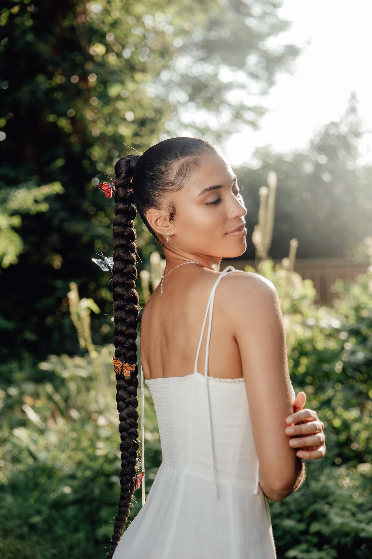 The braided ponytail is an ode to the garden's winding paths and meandering streams. It's a hairstyle that exudes both grace and ease. The butterflies nestled in her hair complete the look, a whimsical touch that connects the model to her surroundings, as if she's a part of this living tapestry of flora and fauna