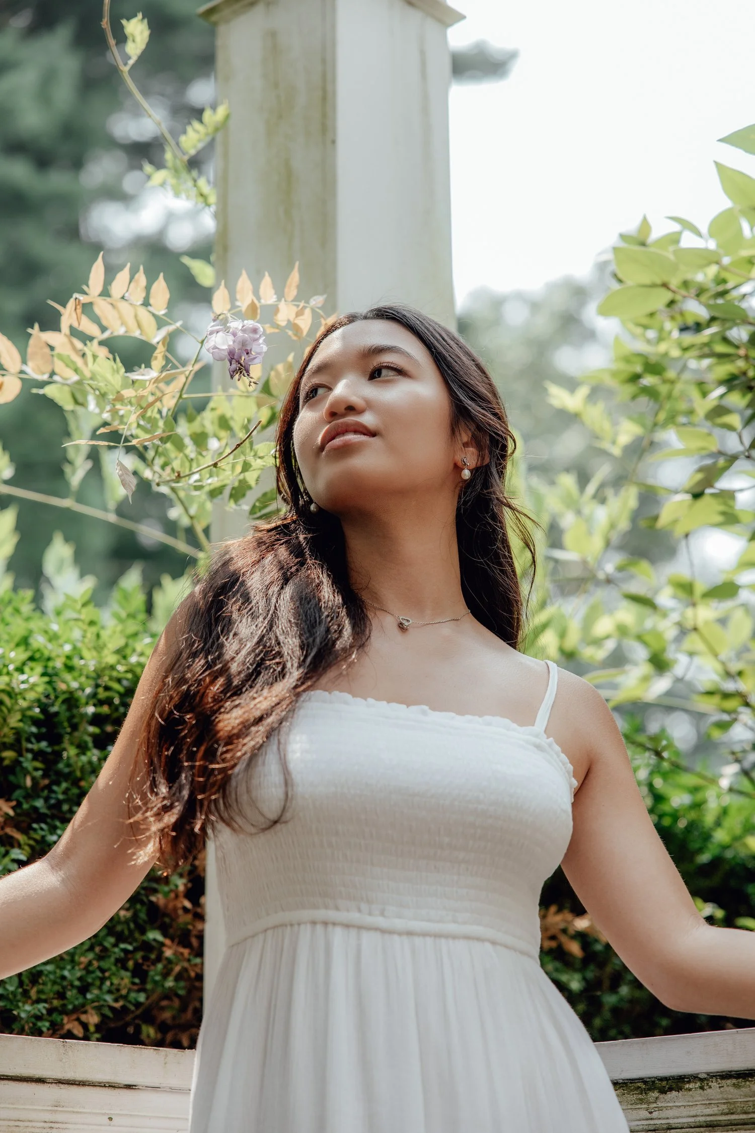 The short white dress our model wears embodies the very essence of simplicity, its flowing fabric a tribute to the gentle rustle of leaves in the wind. Adorned with subtle details that echo the delicate patterns found in nature, it serves as a canvas upon which the garden's vibrant colors come to life. Each fold and contour celebrates the timeless beauty of simplicity, allowing our model to shine amidst the botanical splendor.