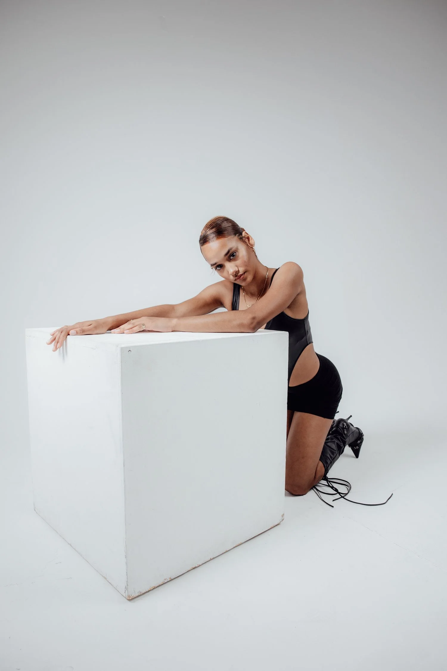 Against the pristine canvas, our model becomes a vision of harmony, her ensemble seamlessly blending into the studio's minimalist backdrop. The clean lines of her outfit create a symphony of simplicity, celebrating the beauty of understated elegance. Each element – from the sleek one-piece to the knee-high boots – speaks volumes with its refined aesthetic.